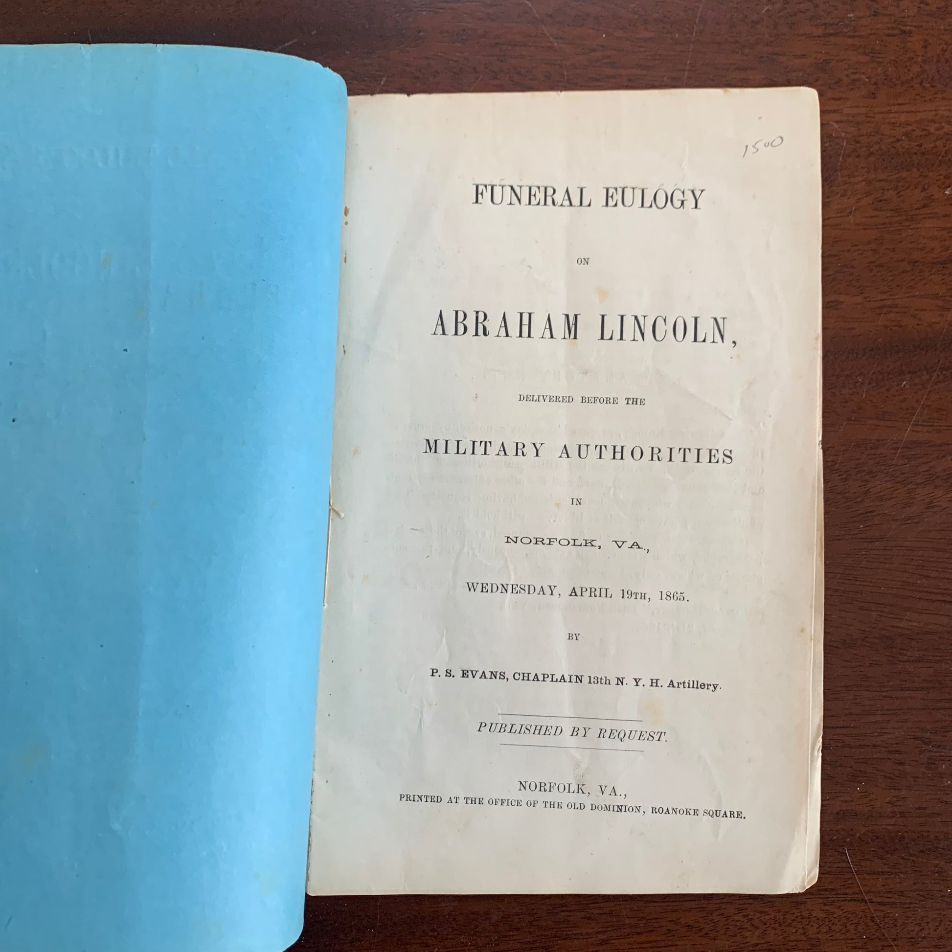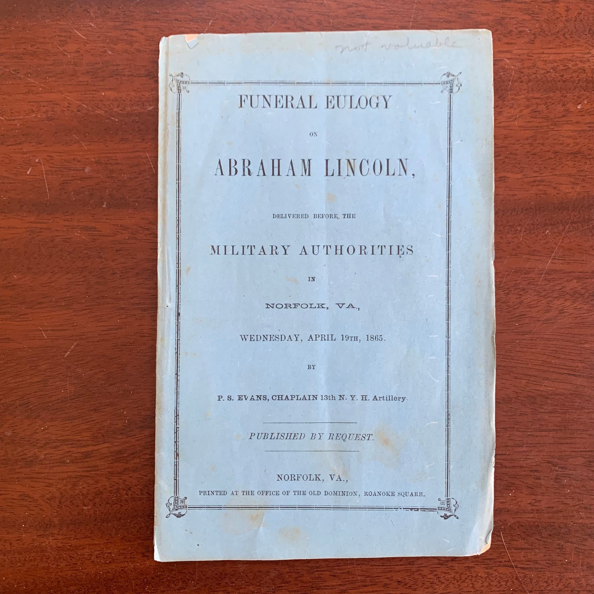 [President Lincoln Eulogy] Funeral Eulogy on Abraham Lincoln Delivered Before the Military Authorities in Norfolk, VA, Wednesday, April 19th, 1865. By P.S. Evans, Chaplain 13th N.Y. H. Artillery.