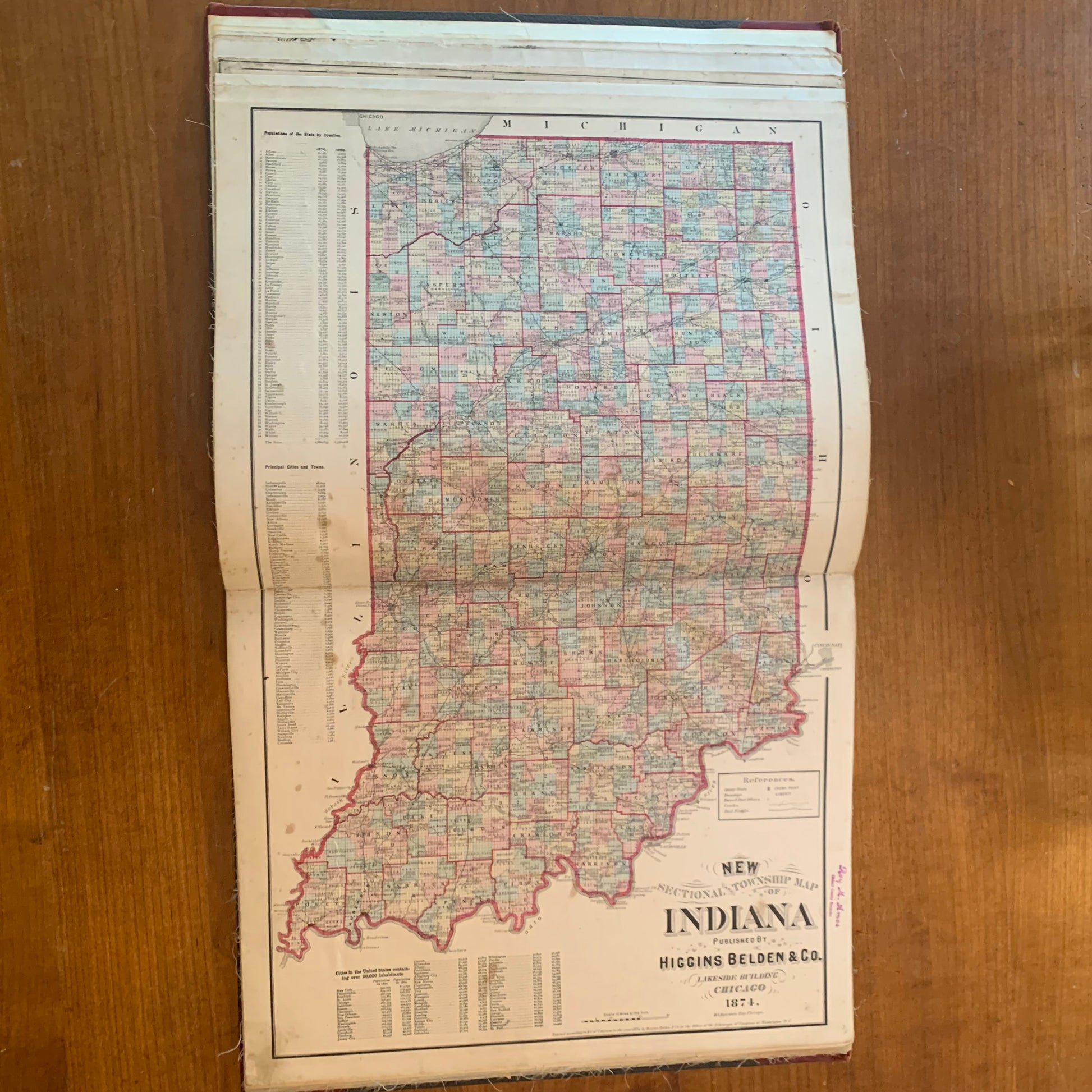 Lakeside Building Corner Clark & Adams Sts., Chicago: Higgins, Belden & Co. 1874. 17 3/4" x 14 1/2" oversized atlas. Missing many of the text pages as they’ve been backed over with canvas, maps appear to all be included and complete. Rebound with quarter leather over pebbled cloth. Gilt titles on spine and owners name on lower right corner. Wear to leather spine and corners. Pages laid onto canvas, many pages including title page stamped with owner's name "Roy M. Amos Elkhart County Recorder." spine and cloth covered boards with gilt cover titles. Wear at spine and Spotting to pages, toning at edges and from glue. Notation on title page in ink. Maps with applied color.